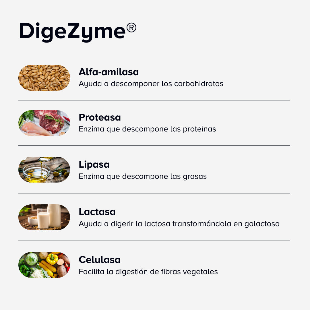 El complejo multienzimático patentado Digezyme® facilita la descomposición y utilización de los nutrientes antes, durante y después de comer.
