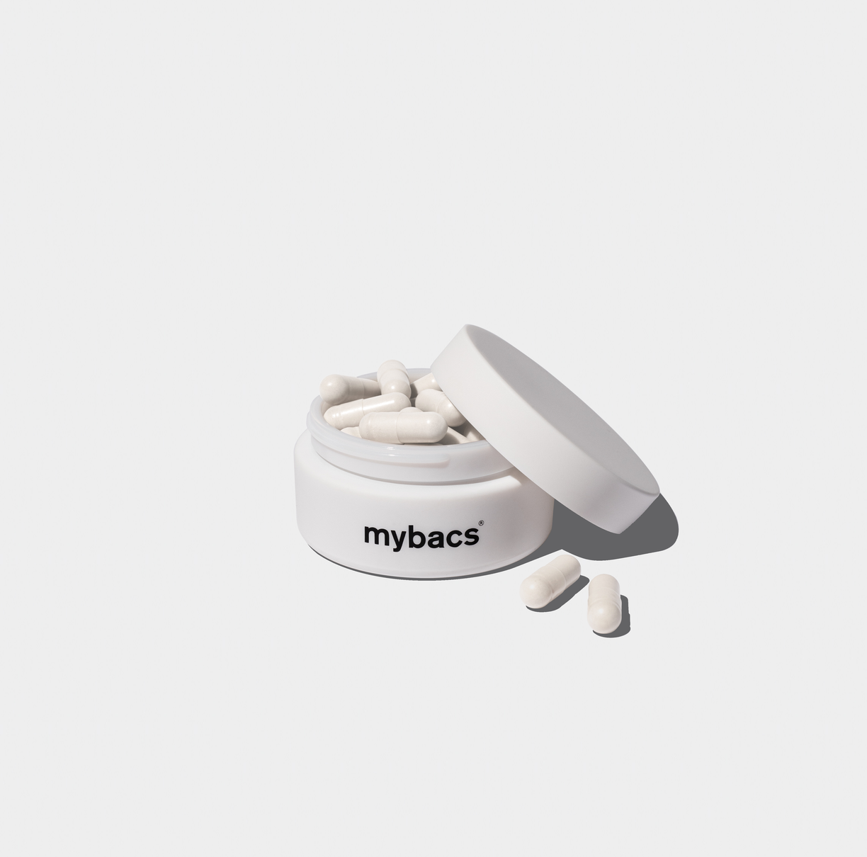 El práctico frasco de viaje ofrece espacio para hasta 30 de sus cápsulas mybacs® favoritas, ¡perfecto para llevar!
