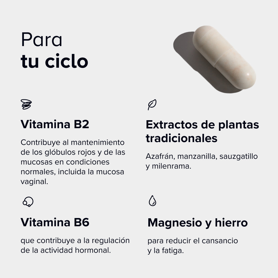 Cycle Flow está diseñado específicamente para mujeres biológicas que desean aliviar de forma natural los síntomas premenstruales durante la segunda mitad del ciclo. Su objetivo es reducir molestias comunes como calambres, cambios de humor e hinchazón, además de apoyar el equilibrio hormonal.