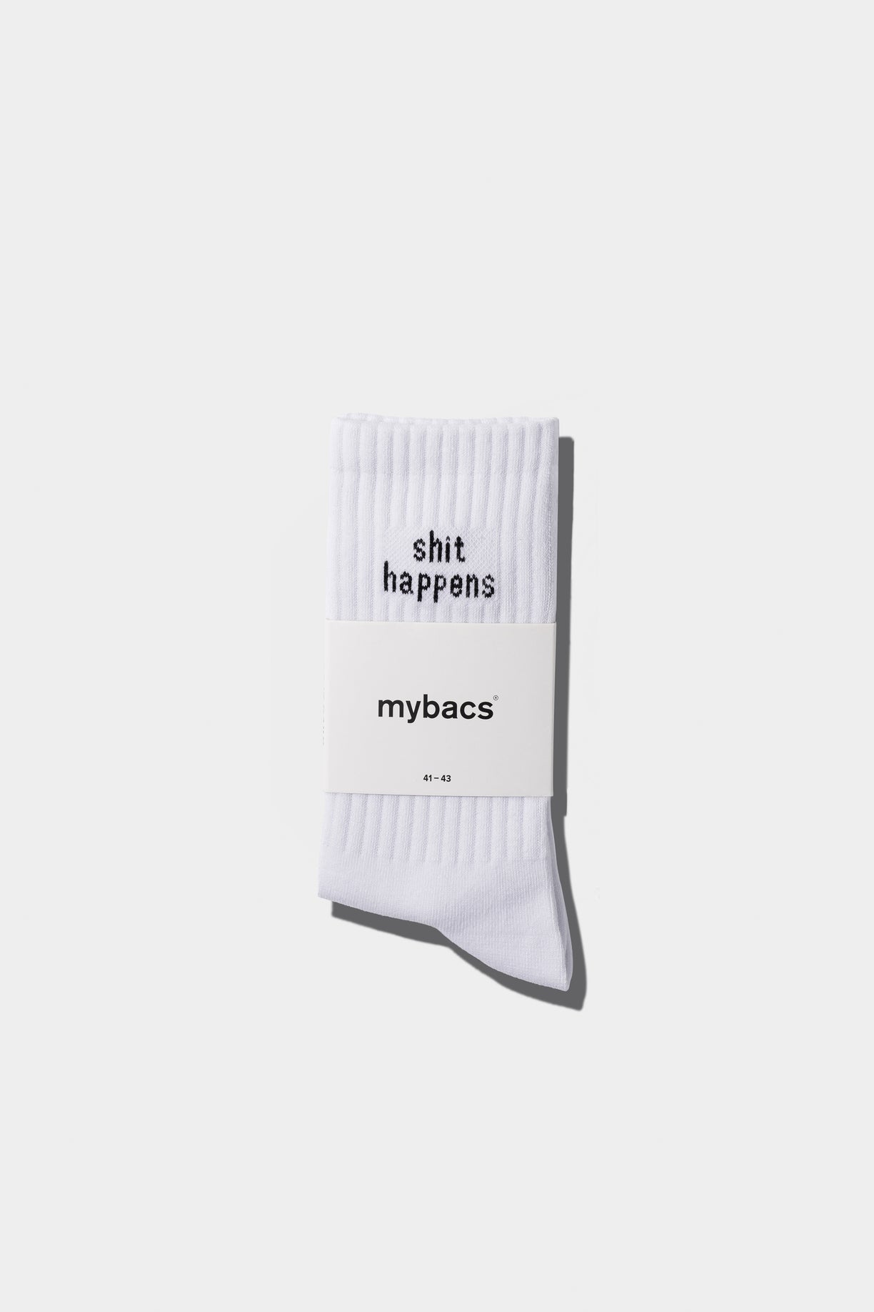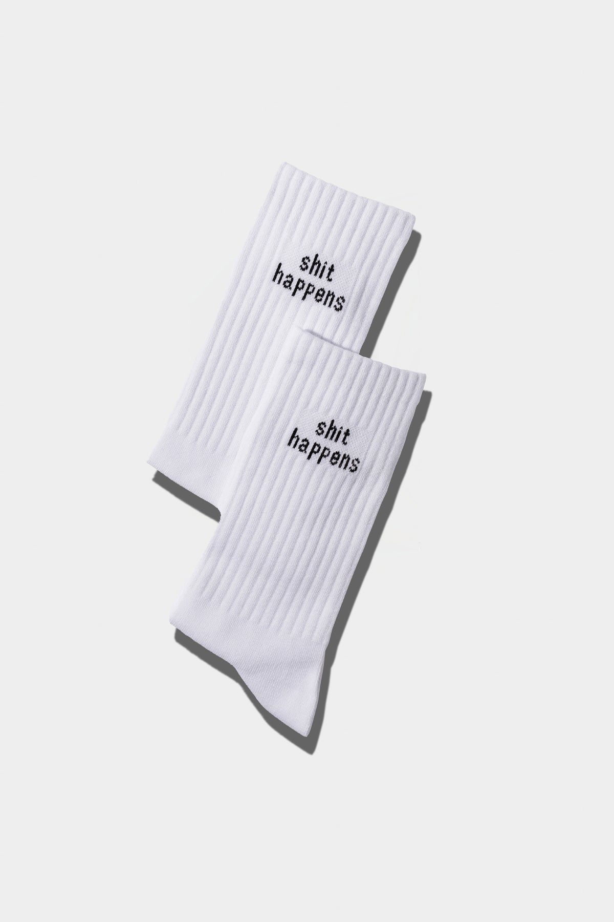 Calzini in cotone a coste con elastico integrato. Ricamo discreto su ogni lato "shit happens".