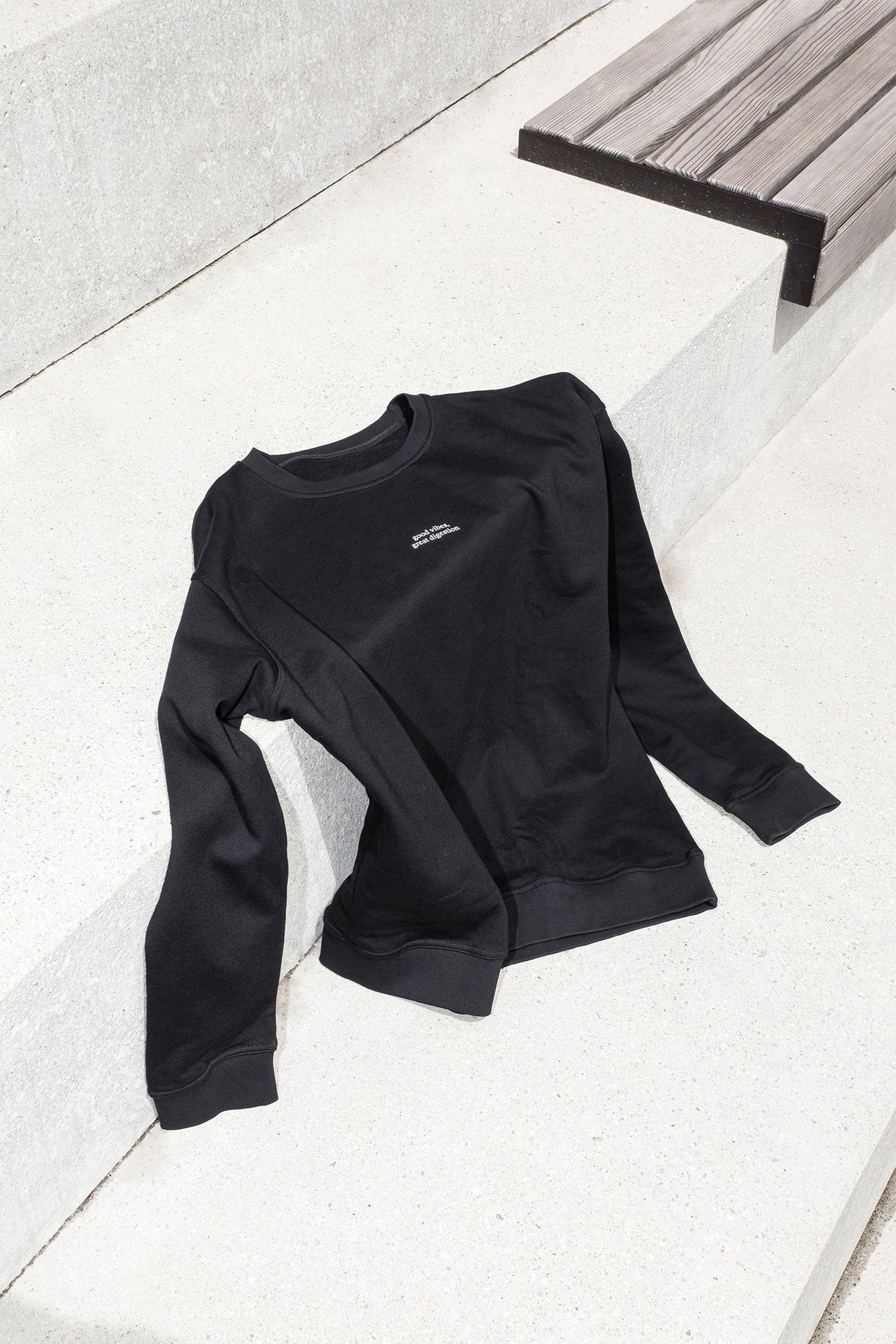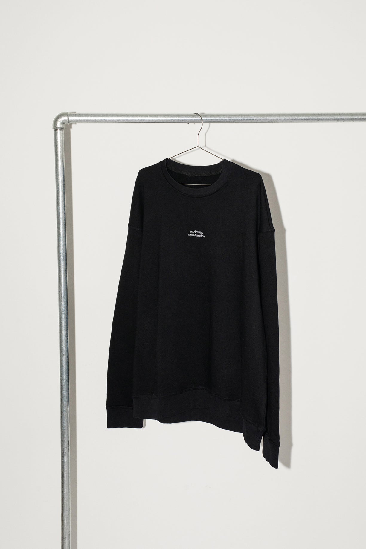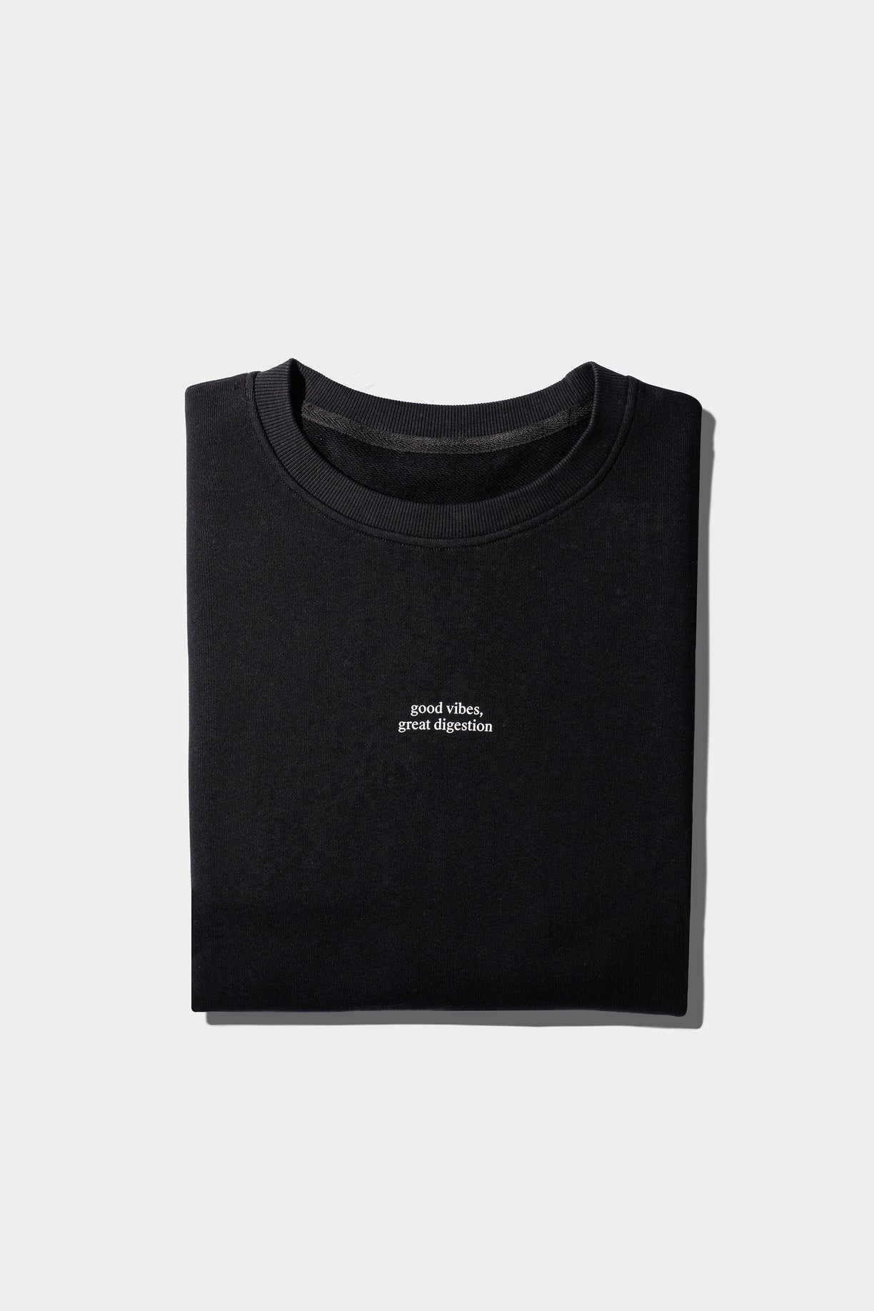 Maglia oversize in cotone con scollo rotondo e maniche lunghe. Finiture a coste. Taglio ampio. Unisex. Stampa discreta sul davanti "buone vibrazioni, ottima digestione"..