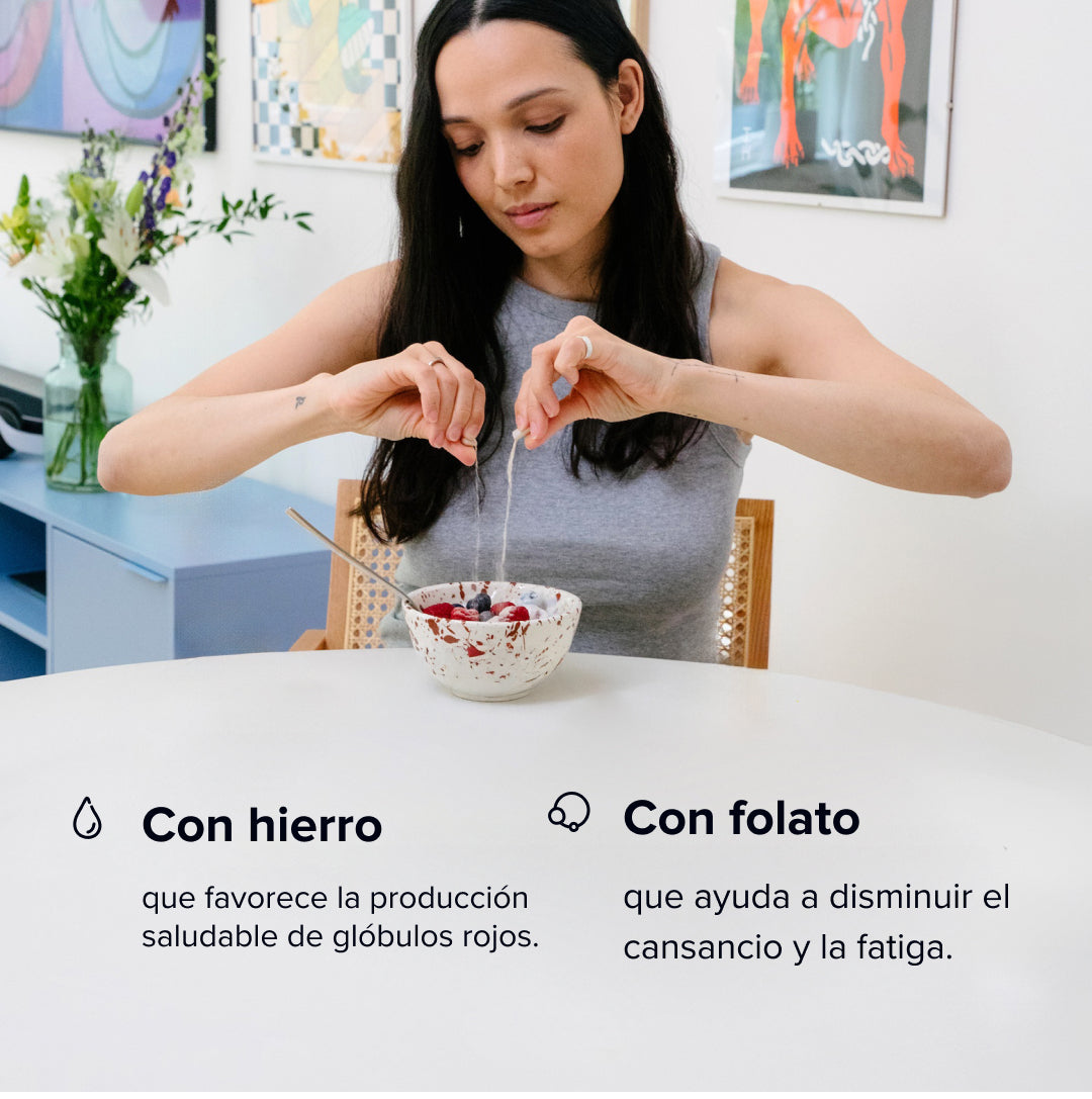 Contiene hierro, especialmente esencial para las mujeres, ya que cubre las mayores necesidades durante la menstruación y ayuda a reducir el cansancio y la fatiga.